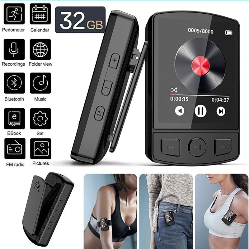 1.8 Inch Screen MP3 Player Portable Sport Clip Walkman HiFi Sound Bluetooth-Compatible 5.0 Wearable Music Player with Button Built-in Speaker FM Radio E-Book Alarm Clock Multiple Languages