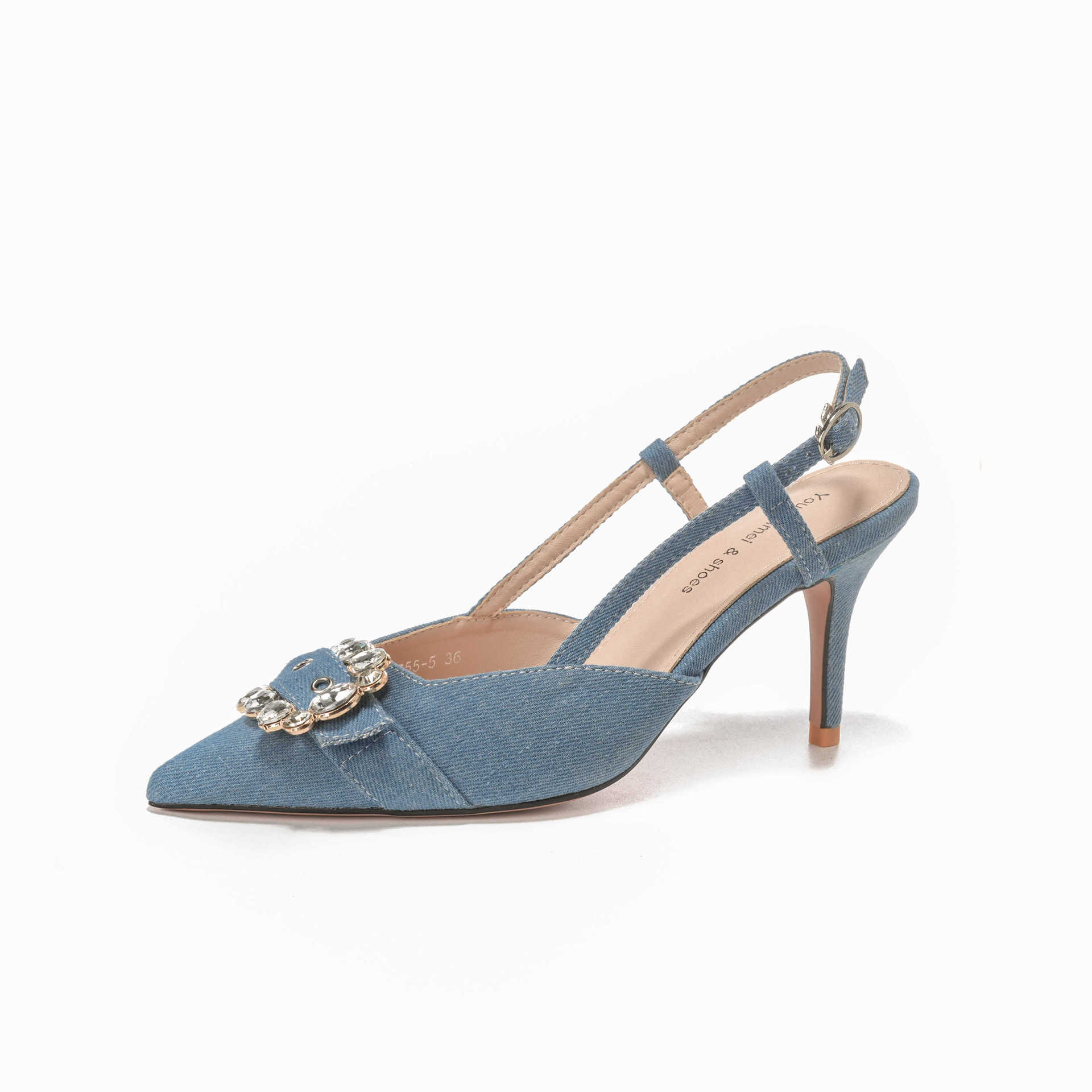 7755-5 Denim Blue Style Belt Buckle Closed Sandals Front Open Back Thin Heel High Heels Commuting