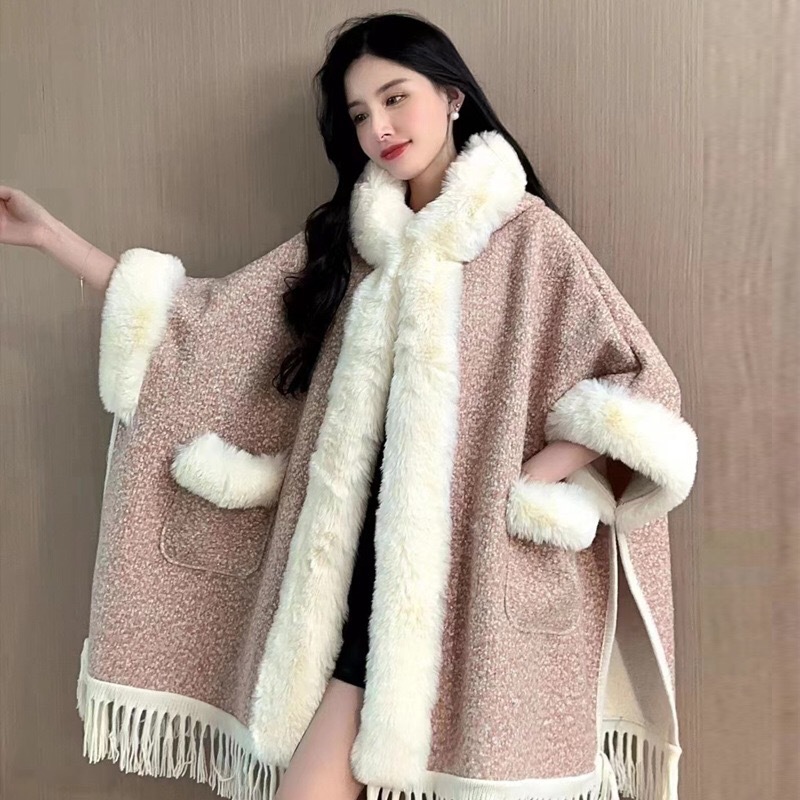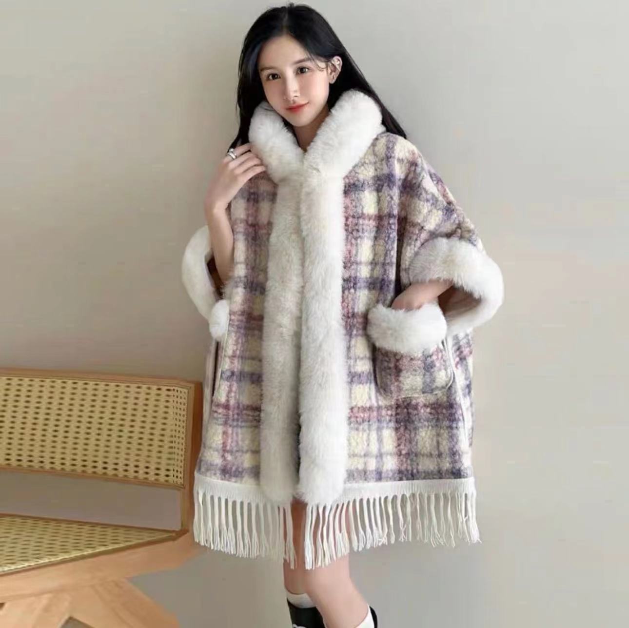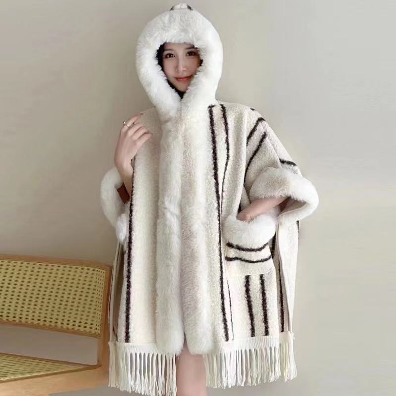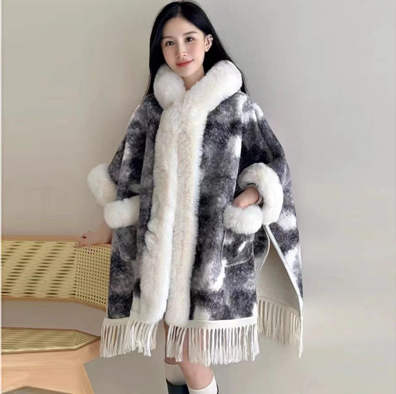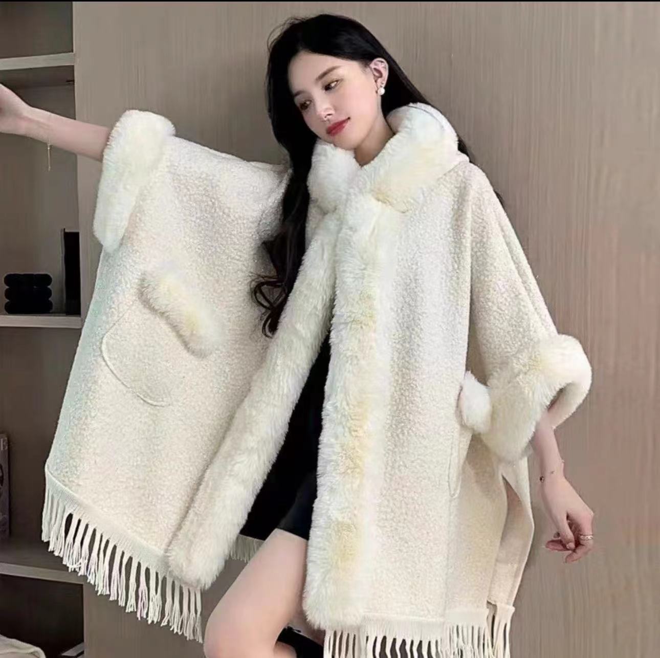 Karusnahast kraega keeb fliisist paksendatud kapuutsiga heledast siidist keeb pluss-suuruses villane mantel