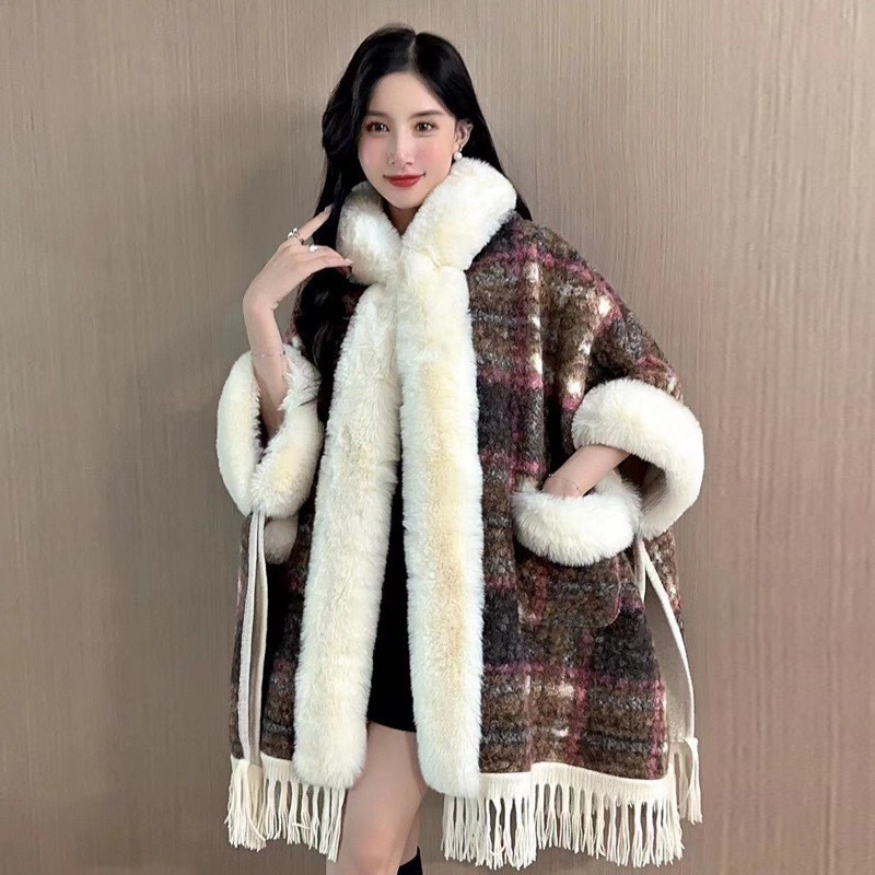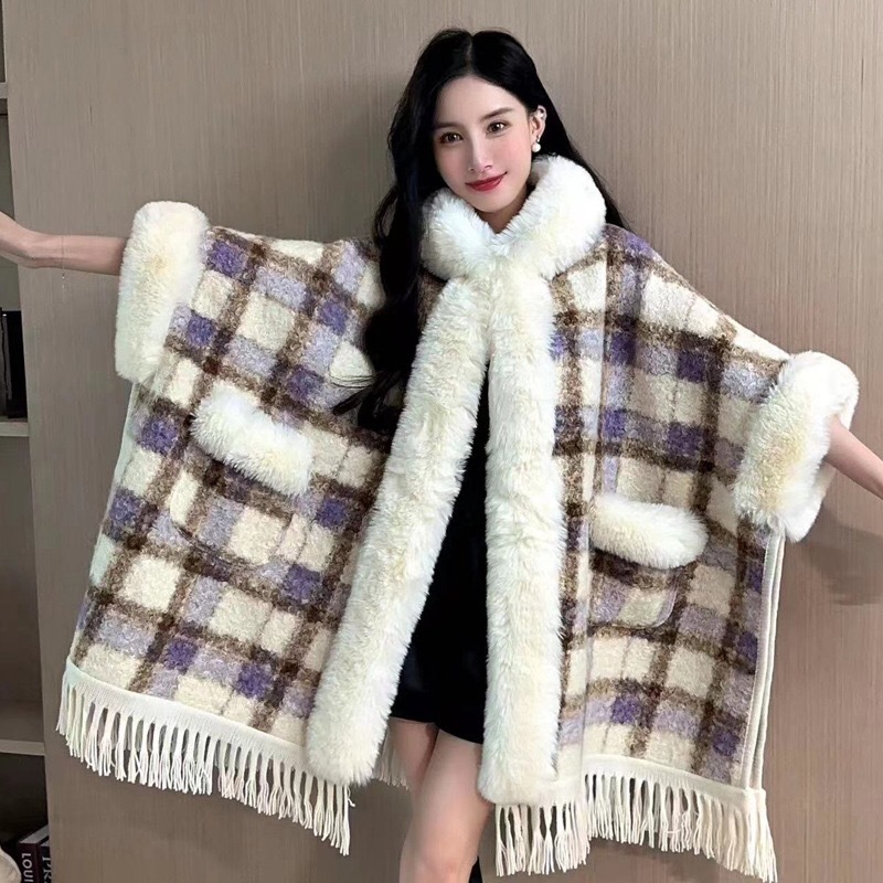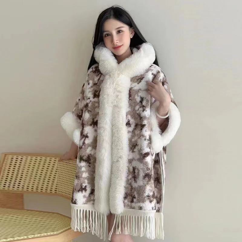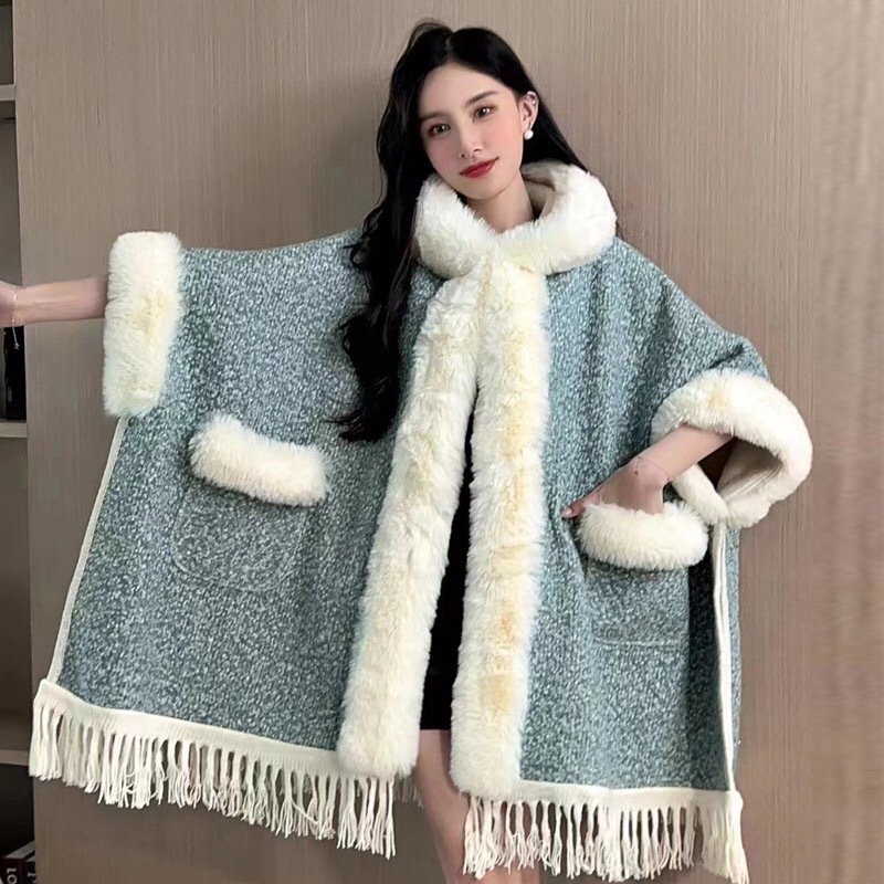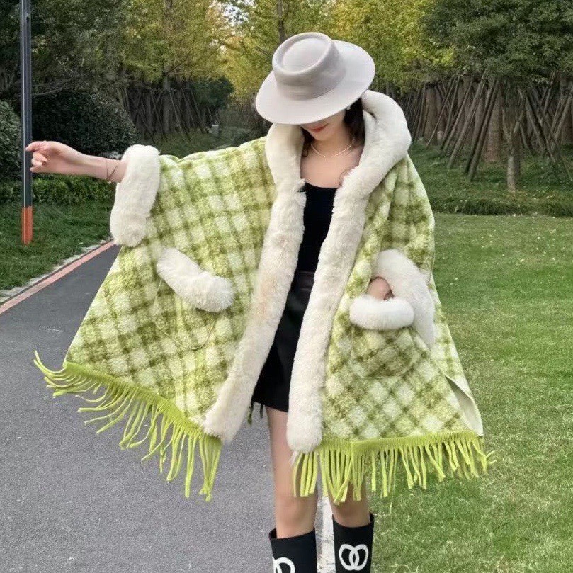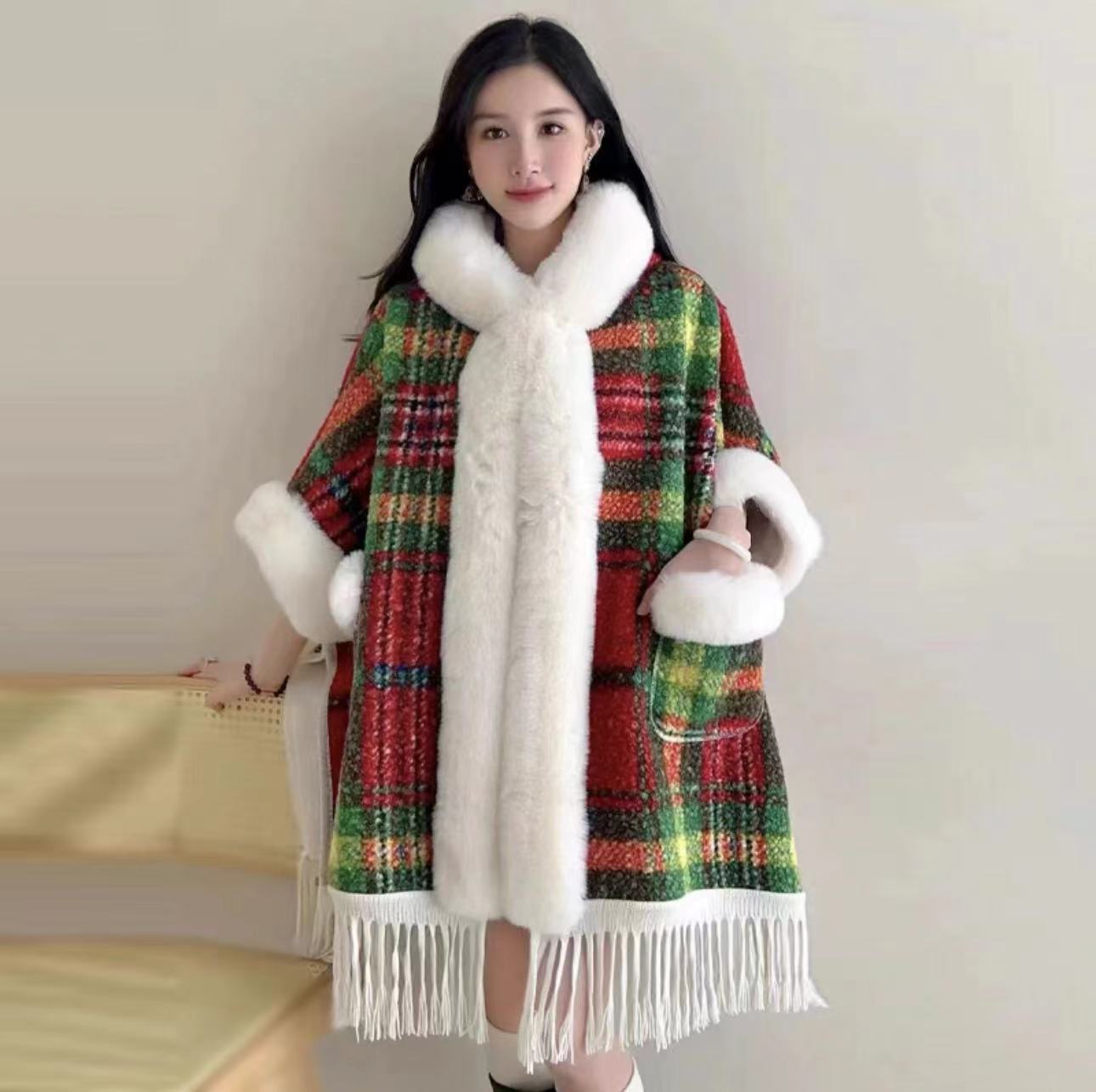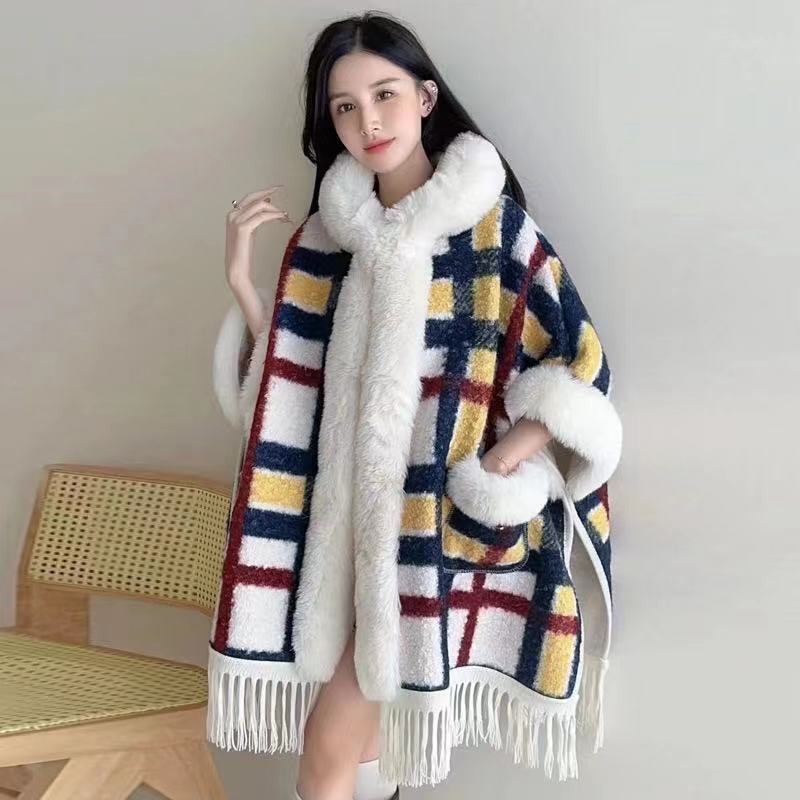 Karusnahast kraega keeb fliisist paksendatud kapuutsiga heledast siidist keeb pluss-suuruses villane mantel