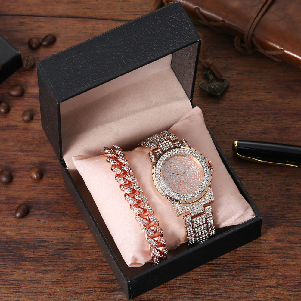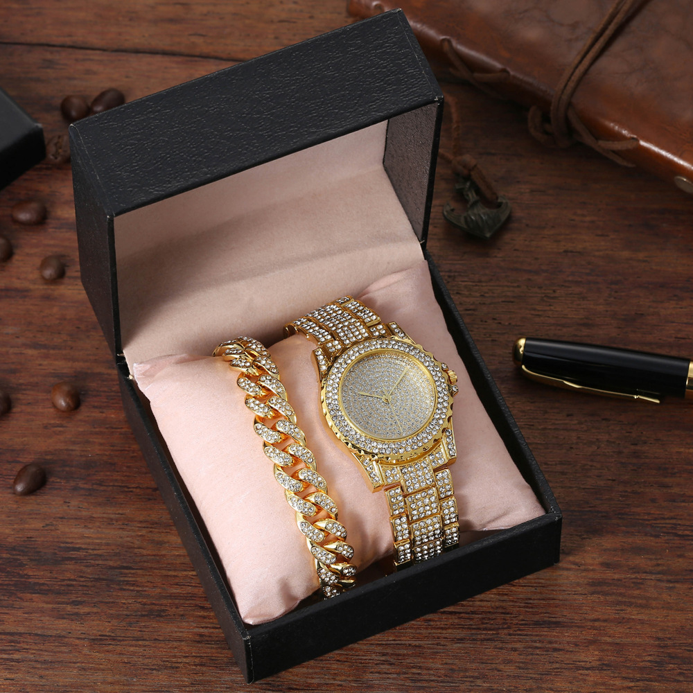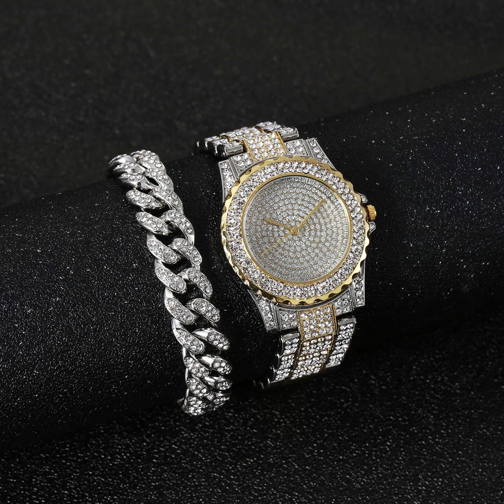 Täisteemantidega äritrendi elegantne, kõiksobiv suur numbrilauaga terasvöö kvartskell + täisteemantkäevõru (2tk/komplekt)