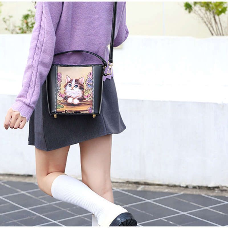 Mischievous Craftsman Bucket Bag, Women's High Grade Genuine Leather, Small and Unique One Shoulder Cross Shoulder Handbag, New Handmade Leather Carving Bag