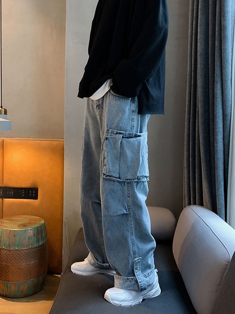 Laiad meeste teksad, sirge säärega lahtised mitmekülgsed tööriided, lühikesed püksid kevadeks ja sügiseks, isapüksid, trendikad