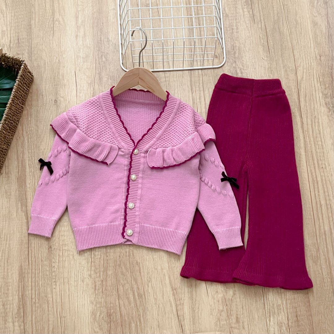 Children's sweater cardigan two-piece knitted jacket for autumn and winter, new style for girls to wear outside with yarn, fashionable and stylish pants set