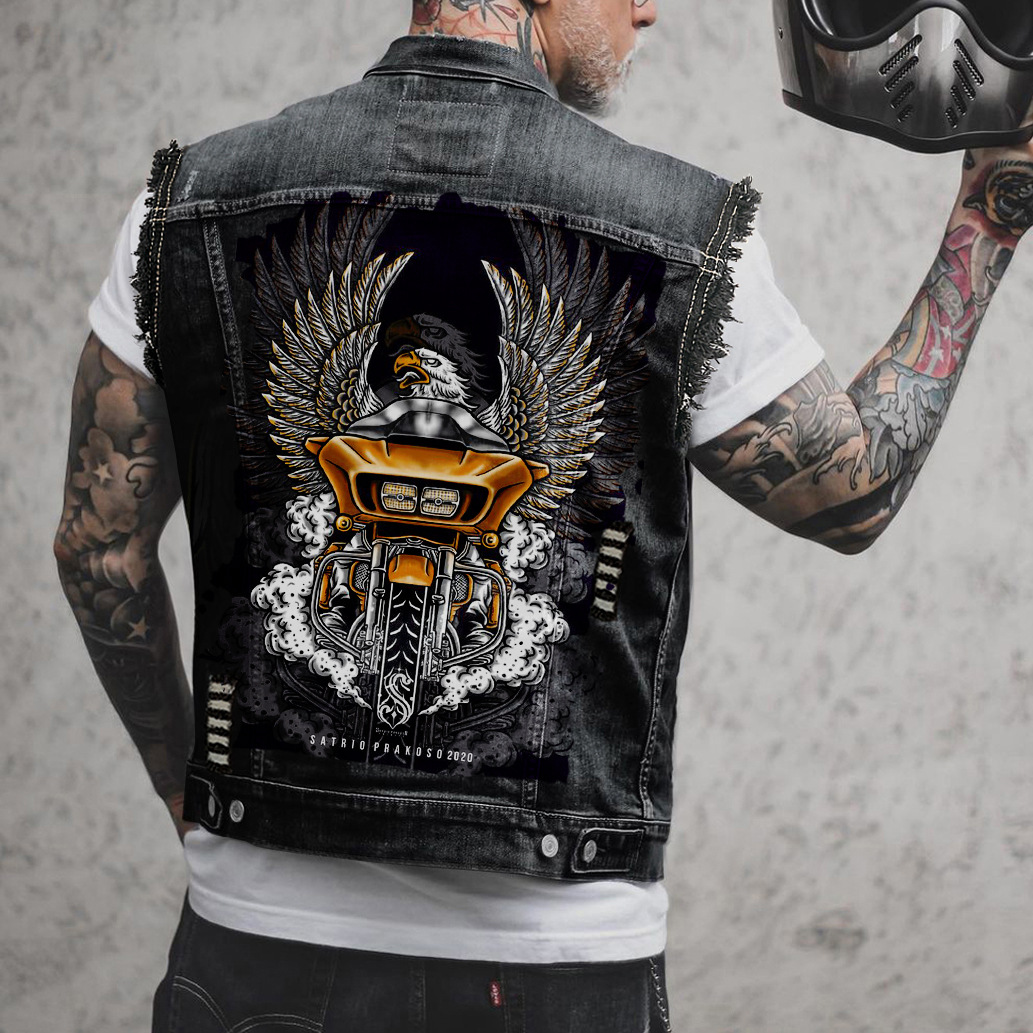 Mootorrattavesti trükitud vabaaja raske käsitöö, kantud ja pestud, meeste teksavarrukateta topp 2285