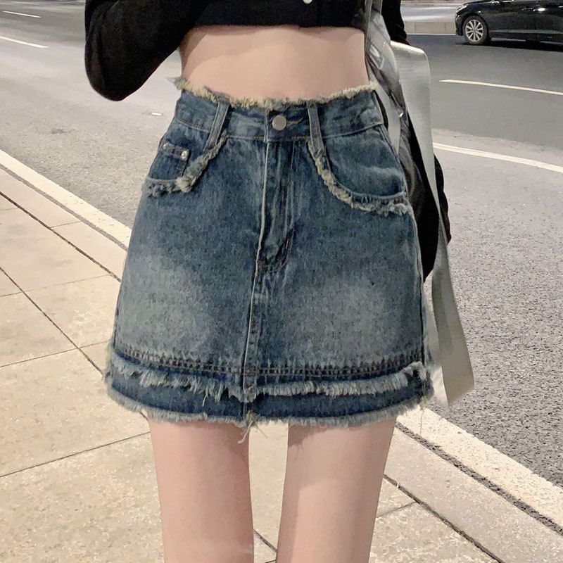 Cowboy Short Skirt Women's Summer New Instagram Style High Waist Plush Edge Small and Small, Casual A-line Half body Wrapped Hip Skirt