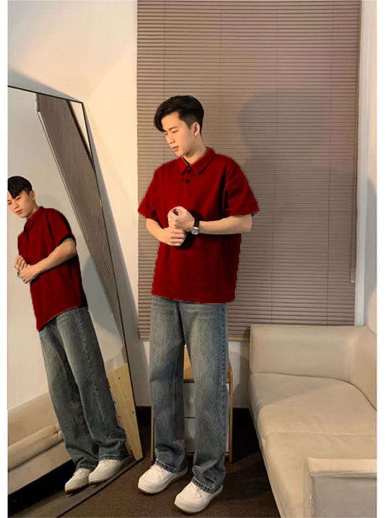 Polo shirt, handsome maple leaf red t-shirt, men's light mature style, high-end feeling, men's wine red short sleeved American half sleeved
