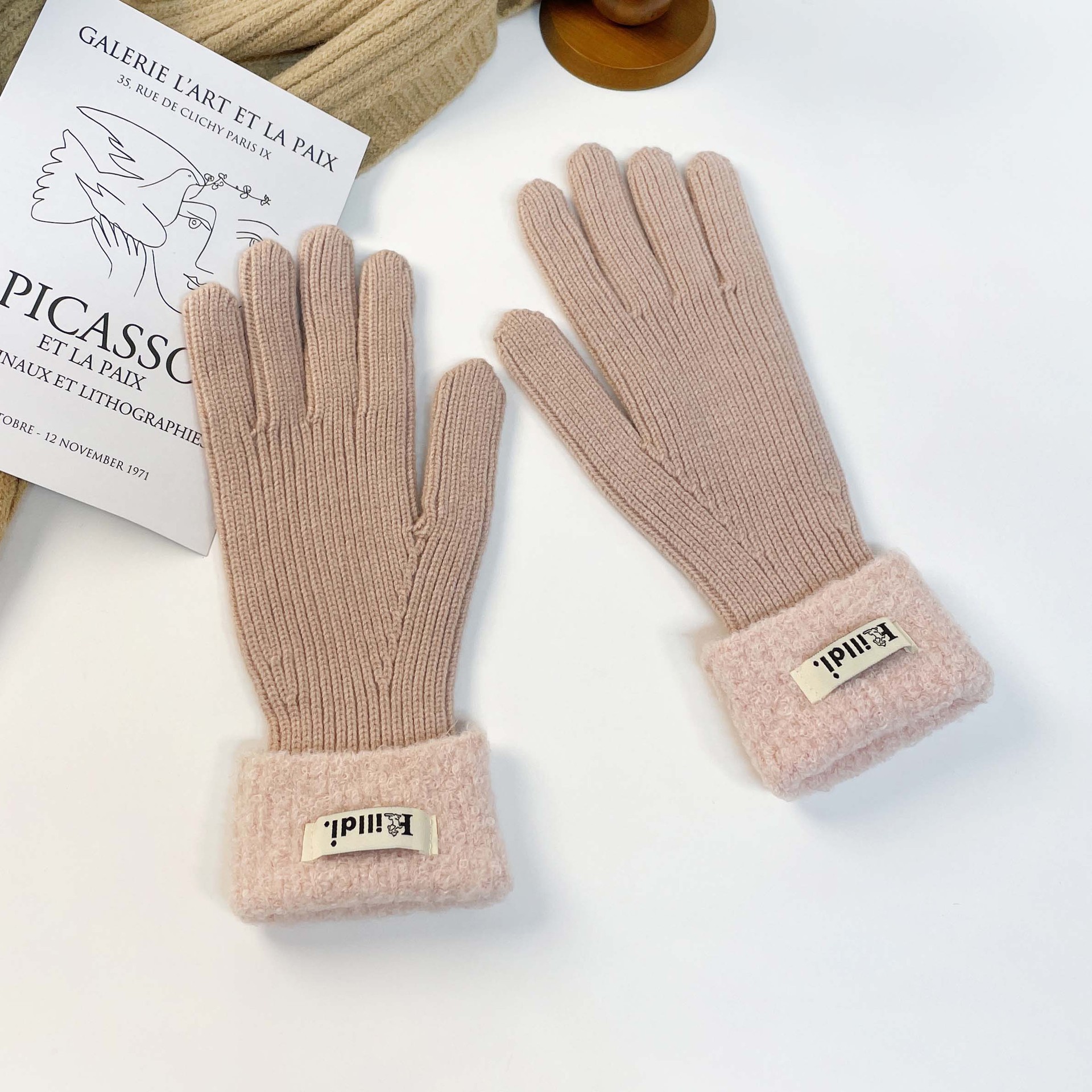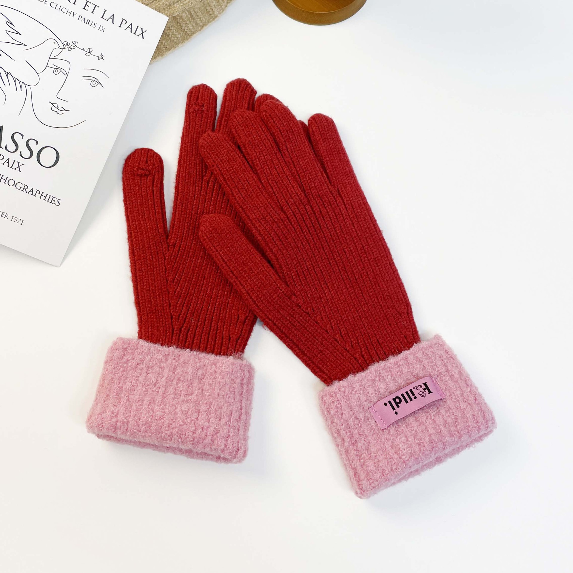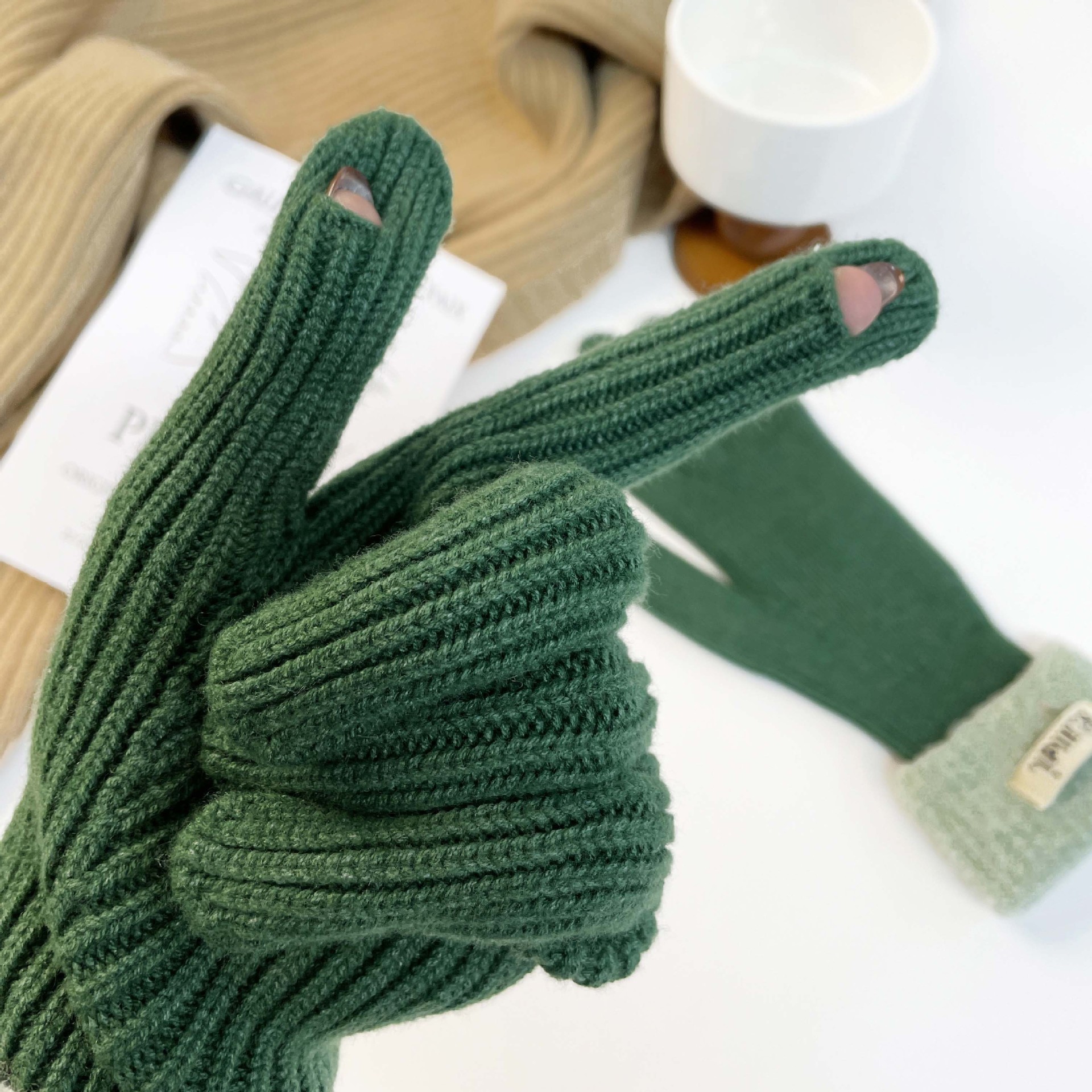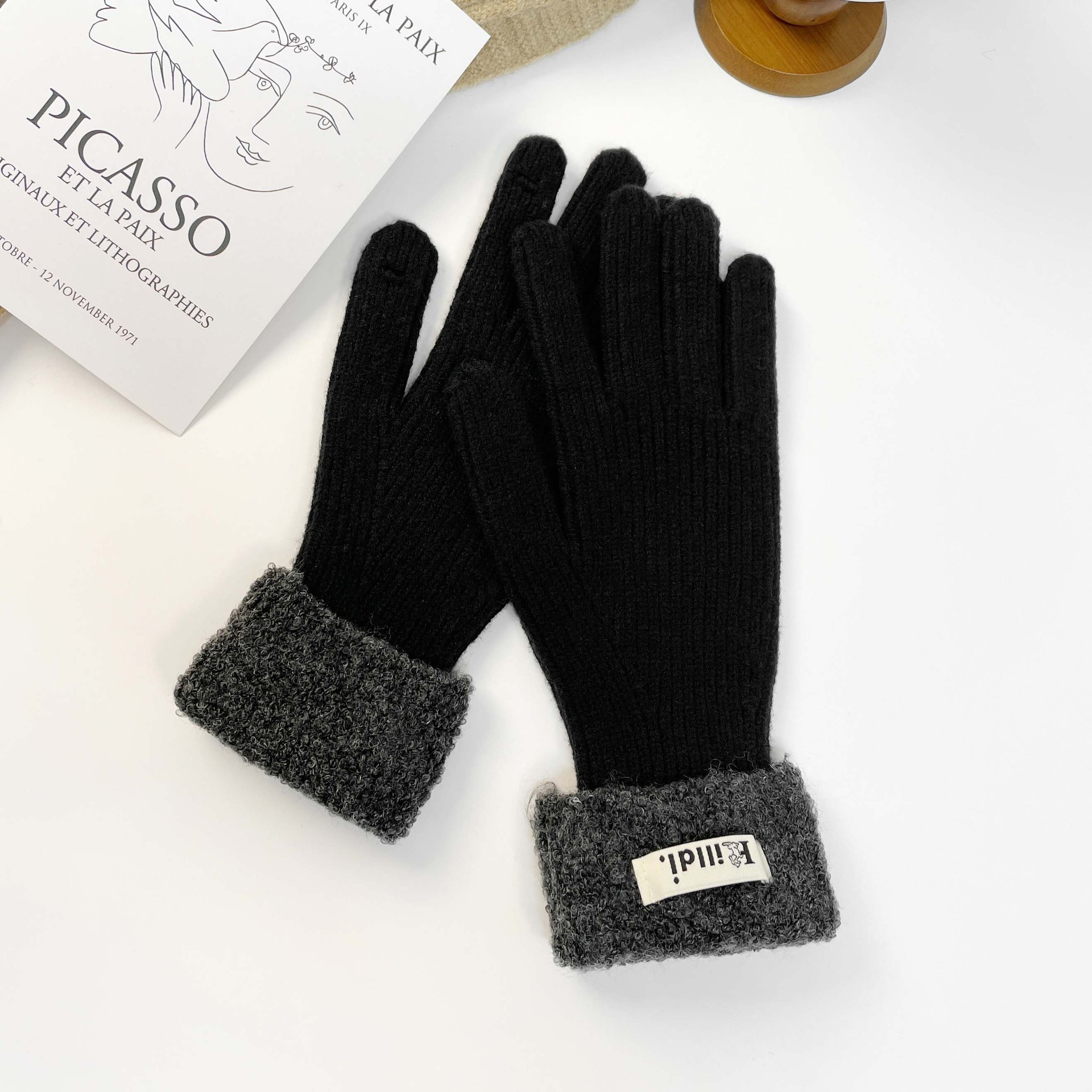 Solid color knitted touch screen gloves 2023 winter Korean version split finger gloves for warmth, anti slip, plush yarn gloves