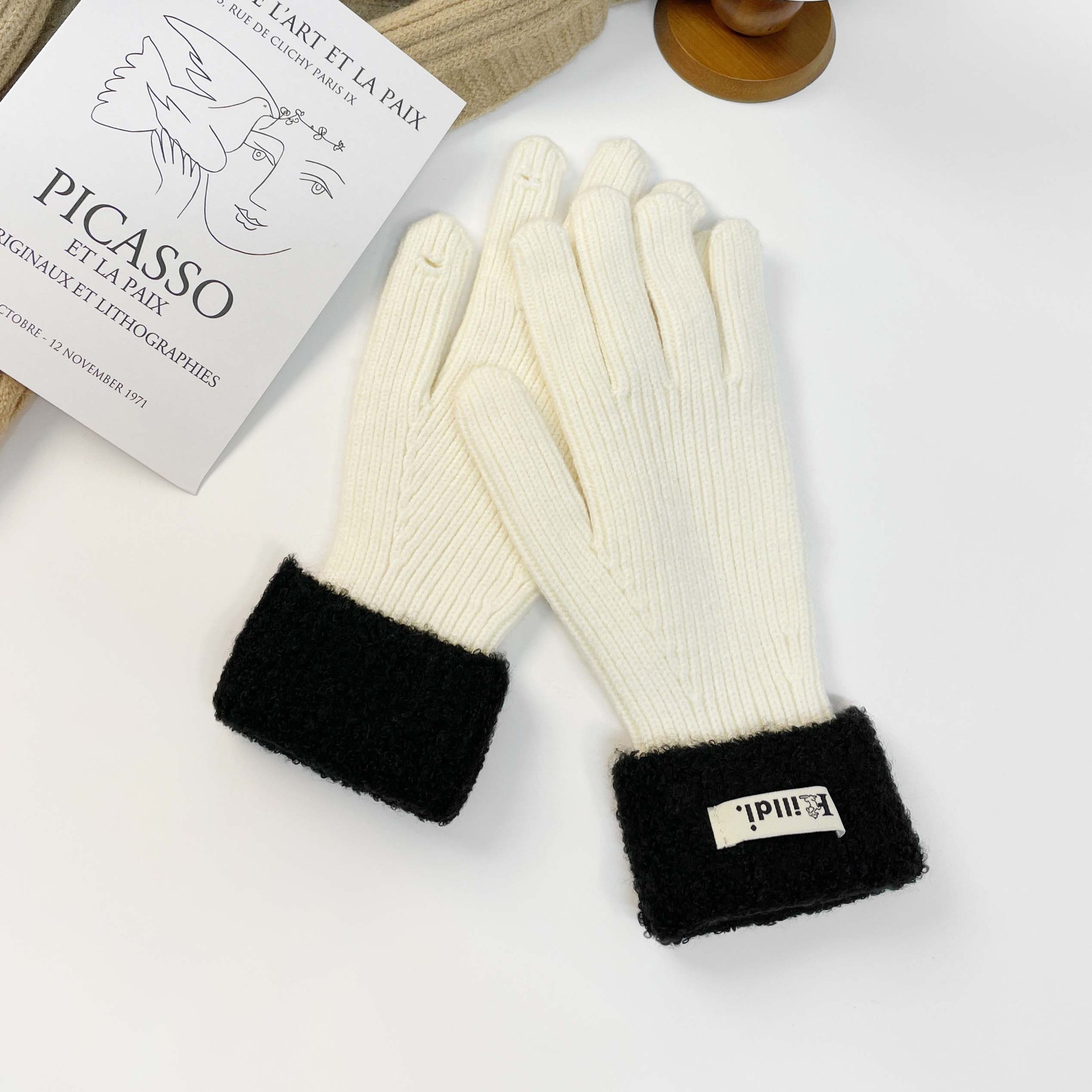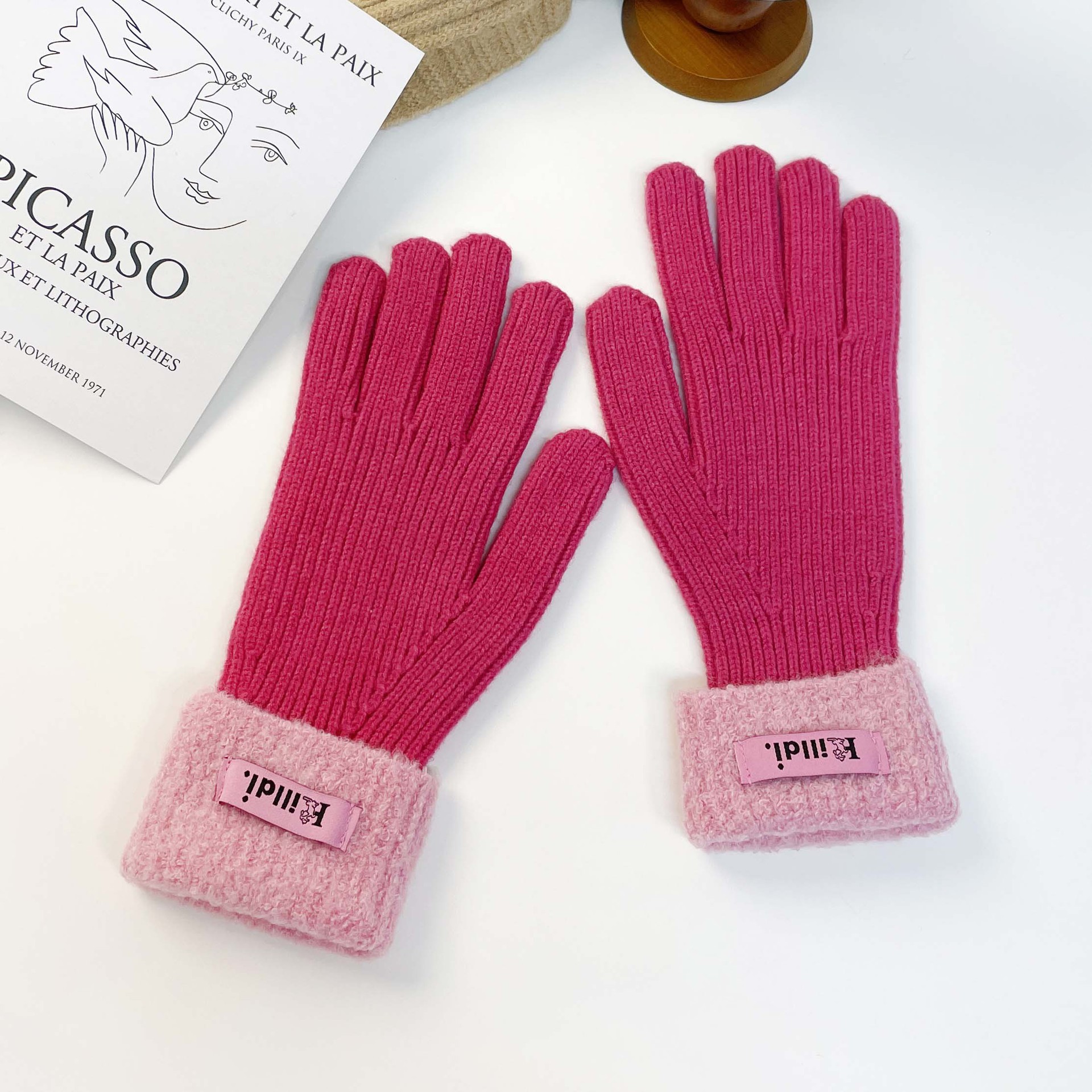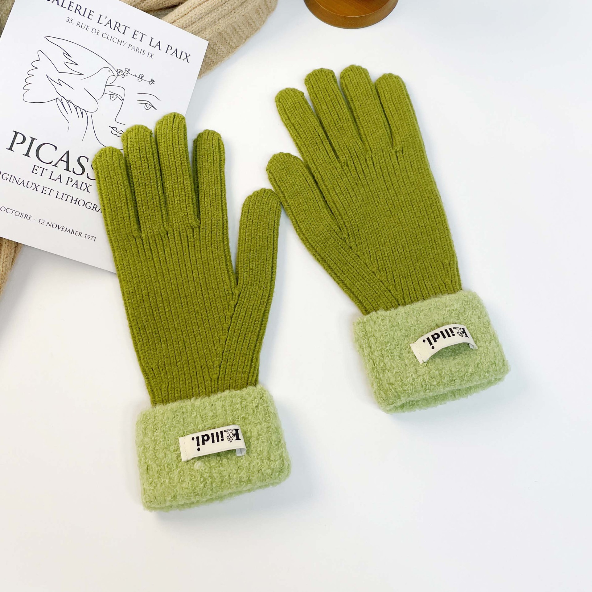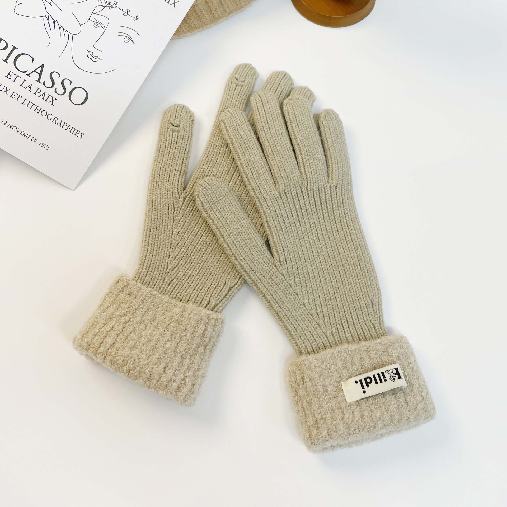 Solid color knitted touch screen gloves 2023 winter Korean version split finger gloves for warmth, anti slip, plush yarn gloves