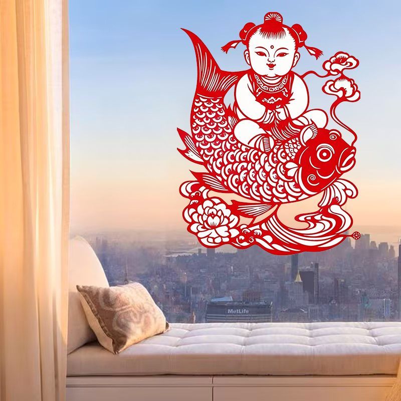 Spring Festival Traditional Handmade Transparent Paper-cut Finished Decorative Painting Fuwa Is Here Every Year Has More Than Enough Glass Window Self-adhesive Sticker Painting