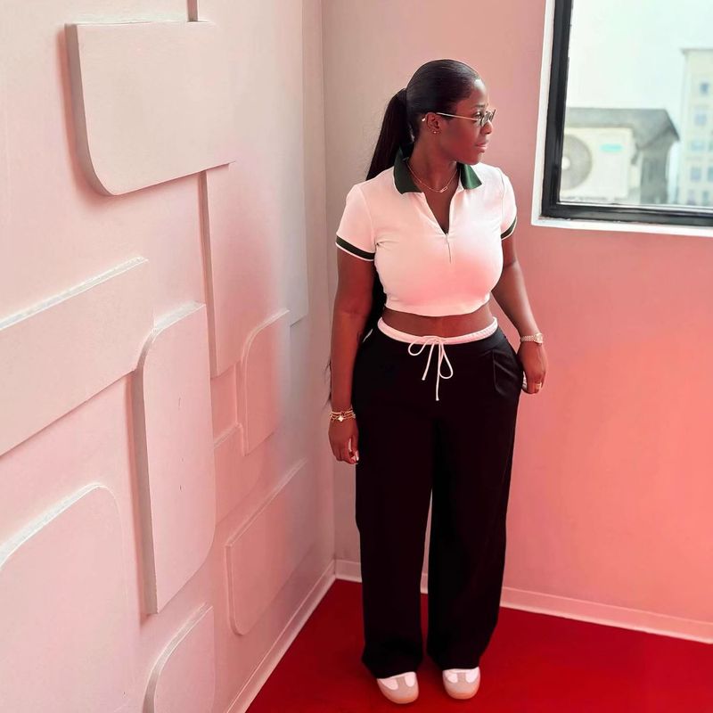 Women's new color blocked lapel short sleeved crop top with lace up straight leg pants set